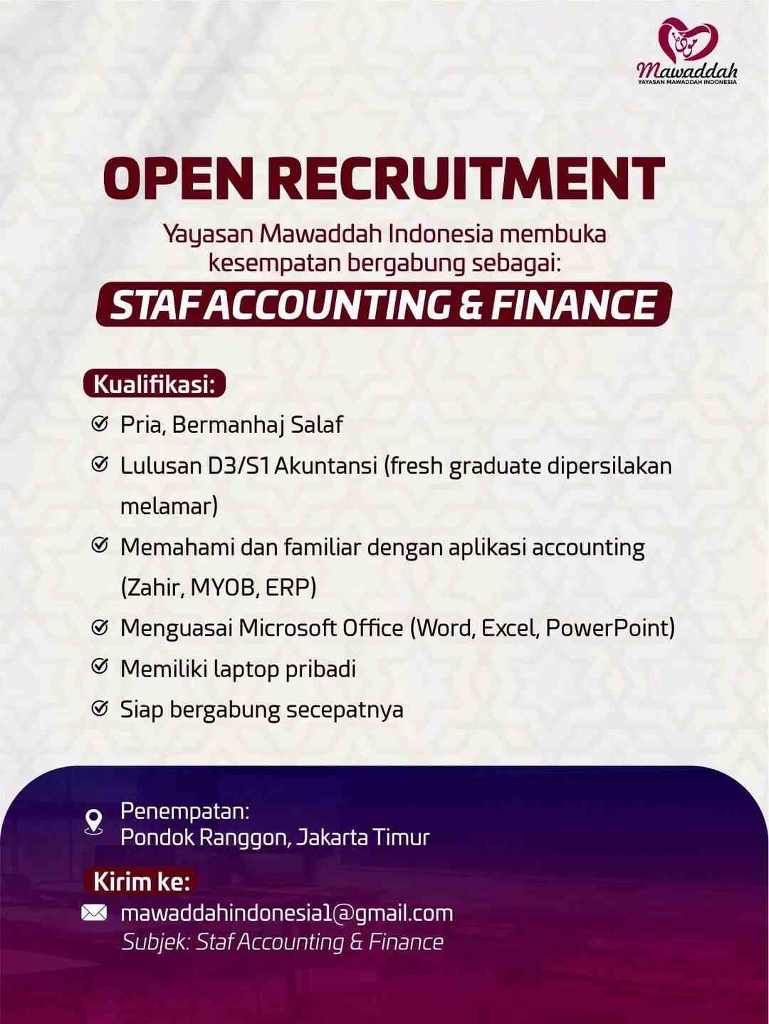 [OPEN RECRUITMENT] Staf Accounting & Finance (Mawaddah Indonesia – Jakarta Timur)