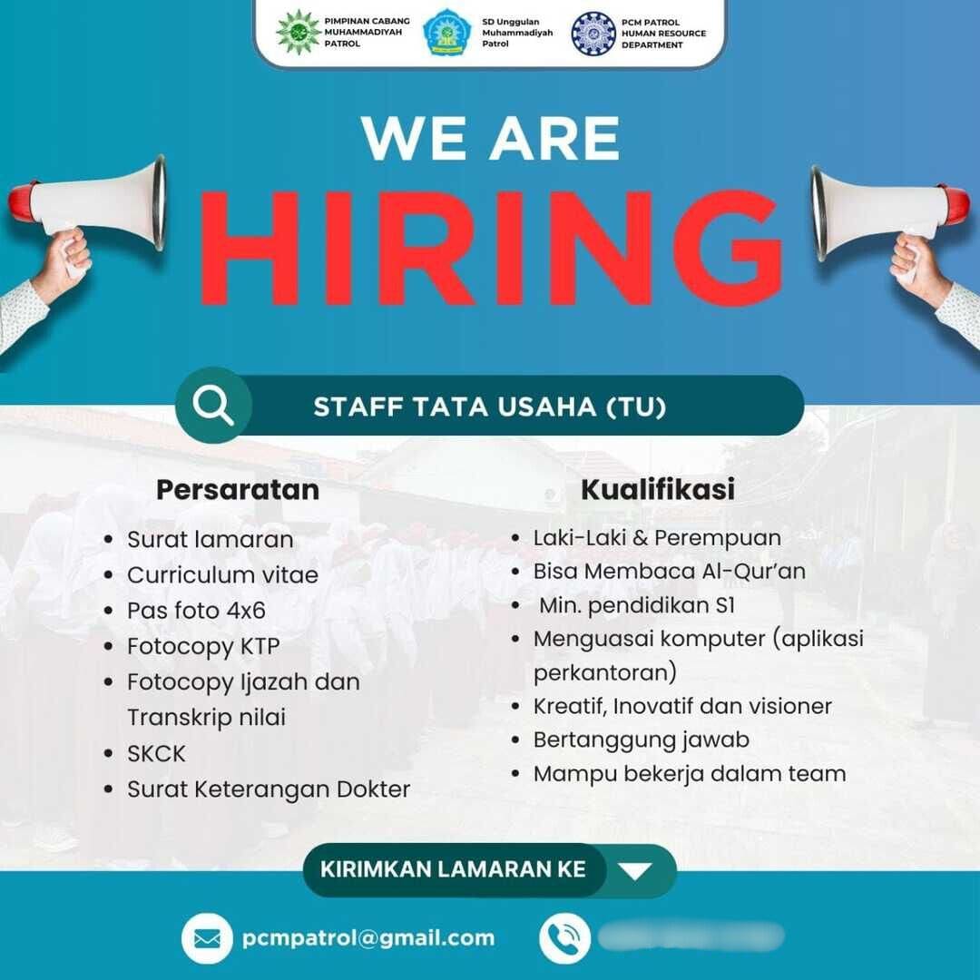 [DIBUKA] Lowongan Kerja – Staff Tata Usaha (TU) (Pimpinan Cabang Muhammadiyah Patrol – Kab. Indramayu)
