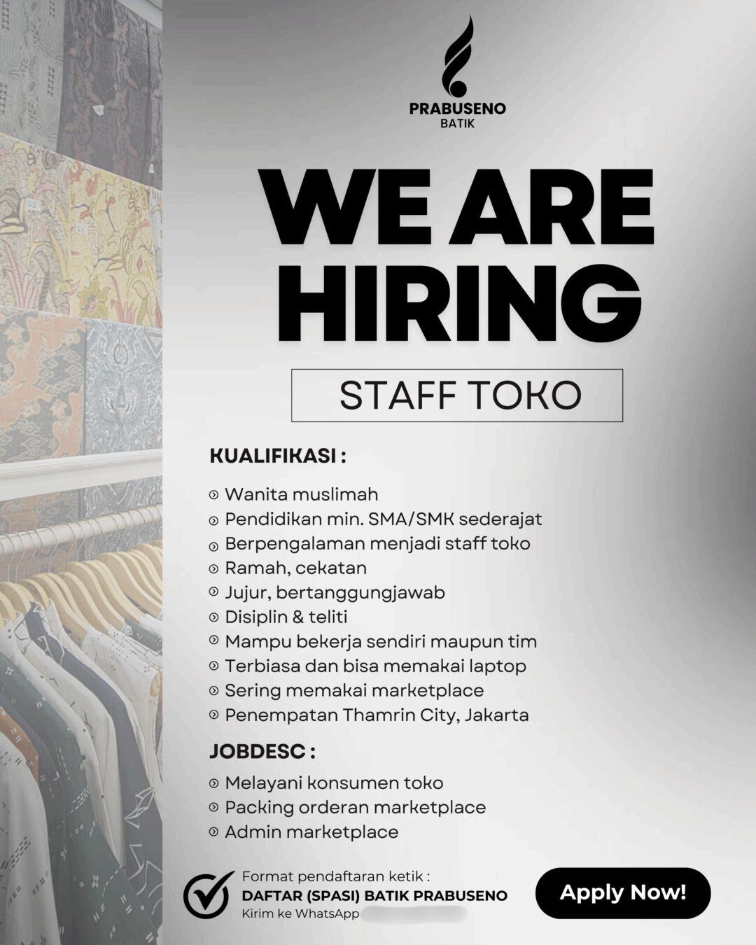 [DIBUKA] Lowongan Pekerjaan – Staff Toko (Batik Prabuseno – Jakarta Pusat)