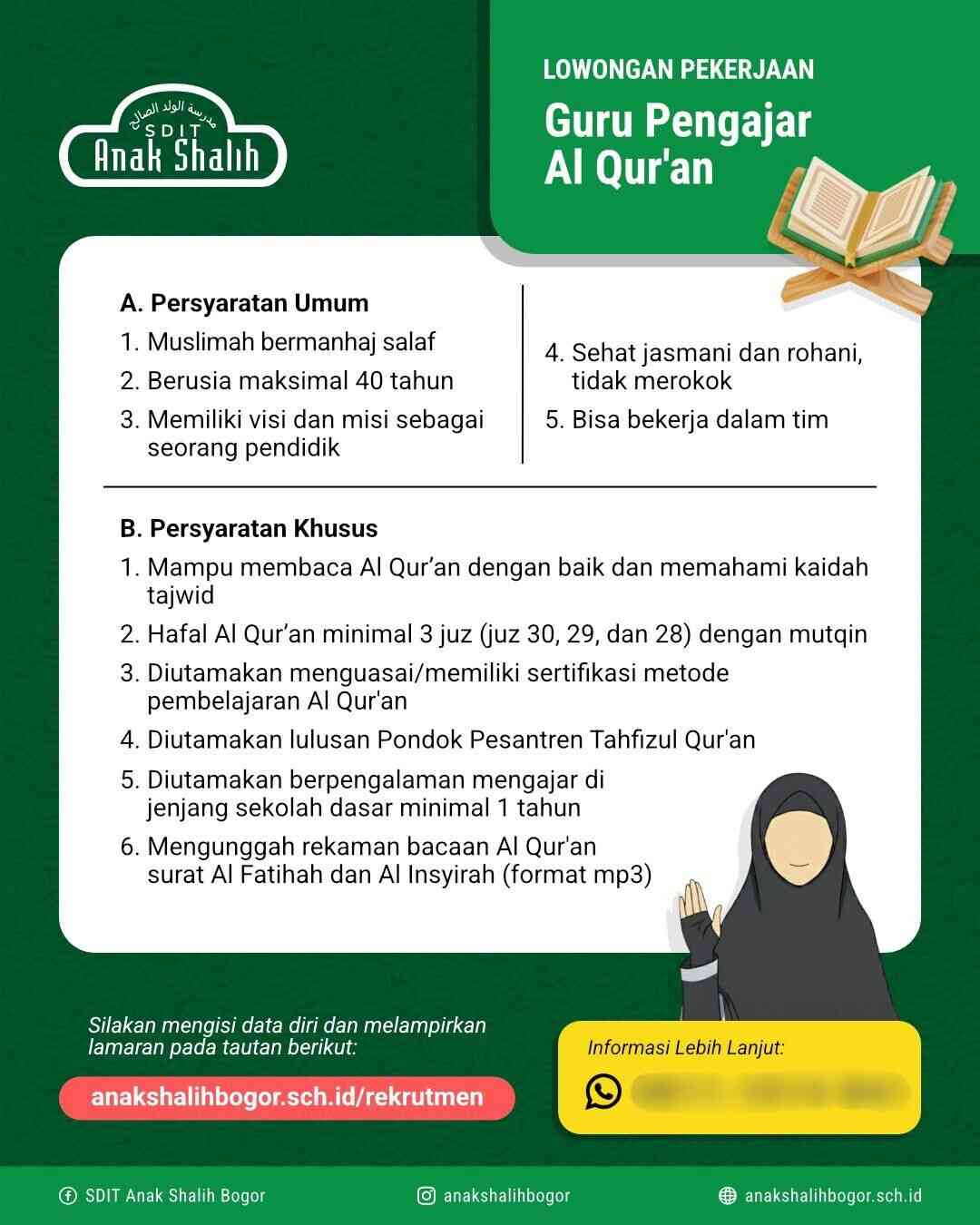 [LOWONGAN PEKERJAAN] Guru Pengajar Al Qur’an (SDIT Anak Shalih – Bogor)