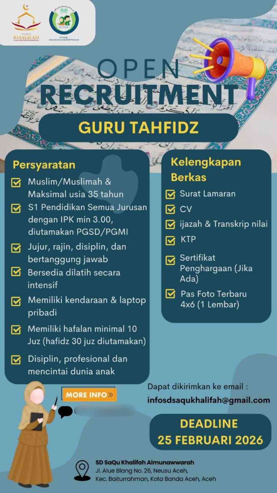 [OPEN RECRUITMENT] Guru Tahfidz (SD SaQu Khalifah Almunawwarah – Banda Aceh)